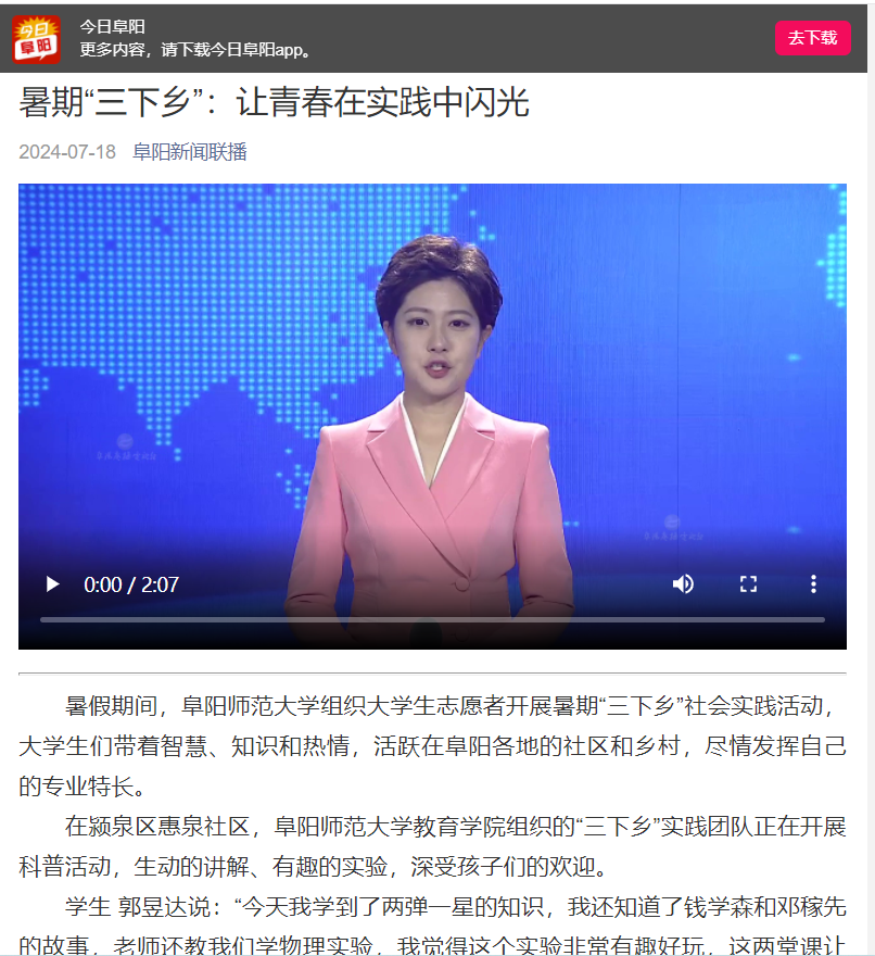 7月18日,阜阳新闻联播报道:暑期“三下乡”:让青春在实践中闪光。文章地址:https://wxfx.fuyangjrfy.com/mag/info/v1/info/wapInfoView?id=344883&themecolor=f30c5c