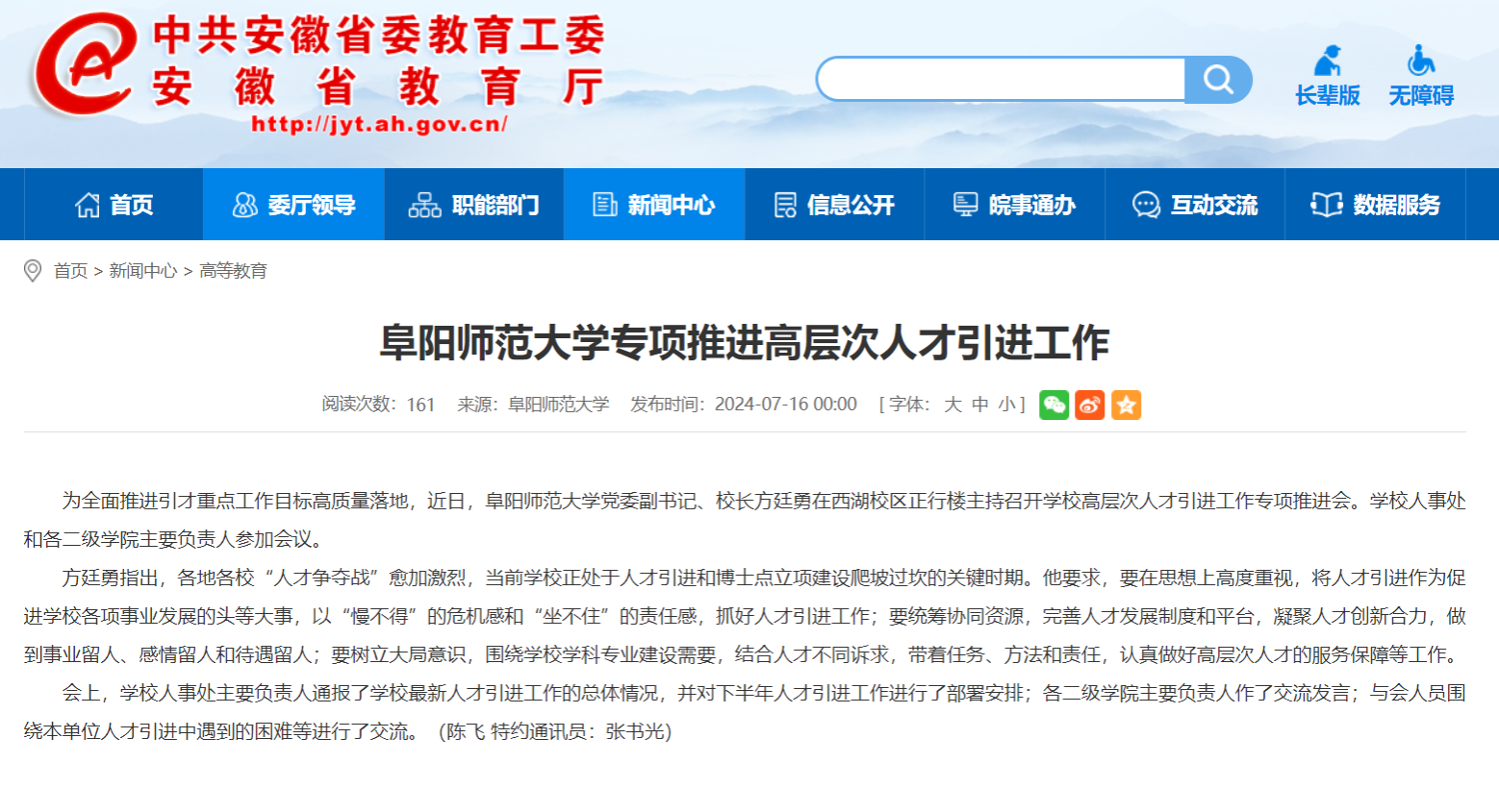7月16日,安徽教育网报道:阜阳师范大学专项推进高层次人才引进工作。文章地址: