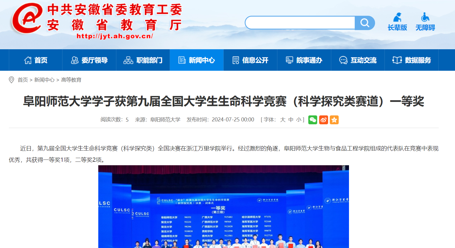 7月25日,安徽教育网报道:阜阳师范大学学子获第九届全国大学生生命科学竞赛(科学探究类赛道)一等奖。文章地址: