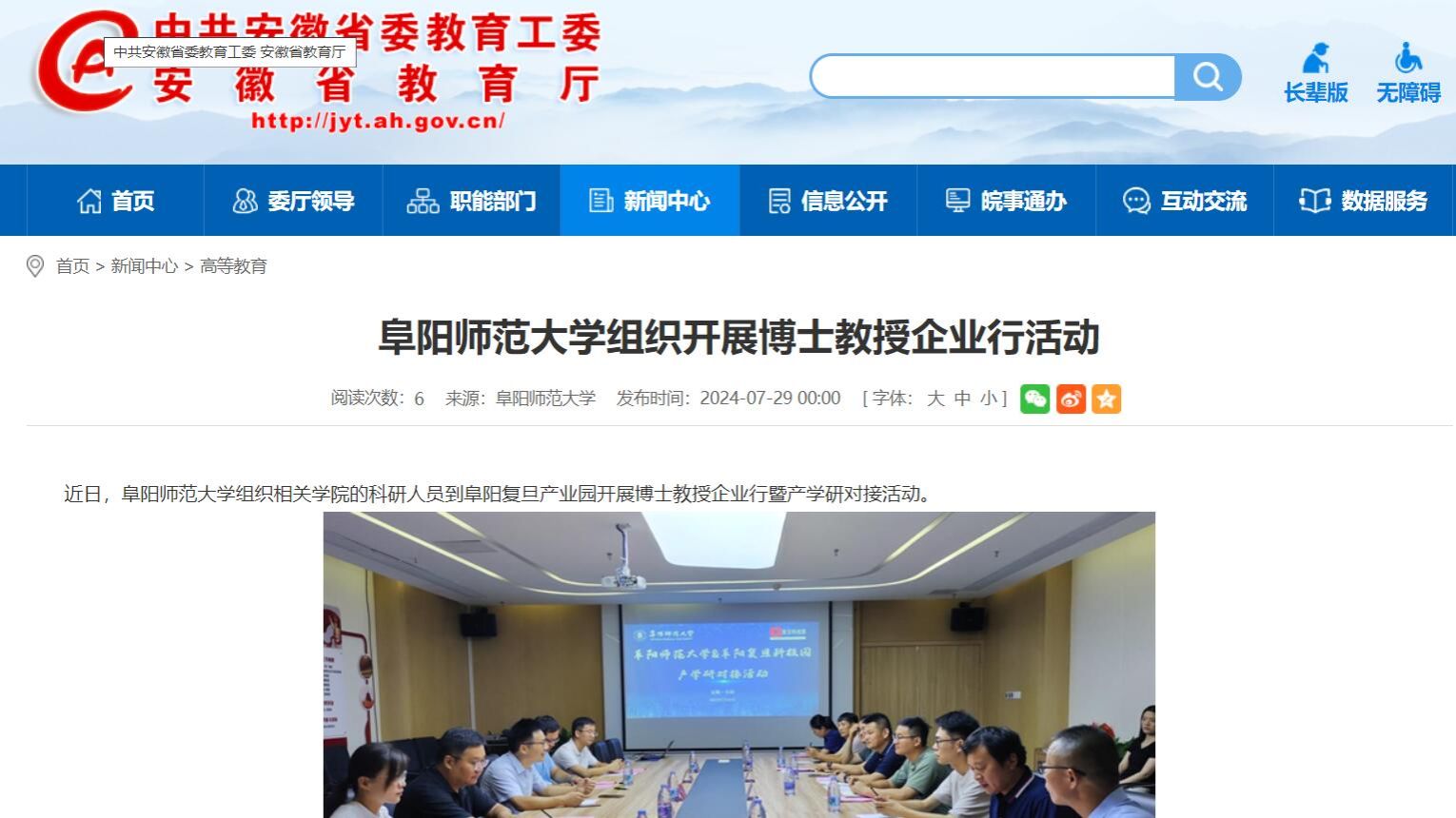 7月29日,安徽教育网报道:阜阳师范大学组织开展博士教授企业行活动。文章地址:
