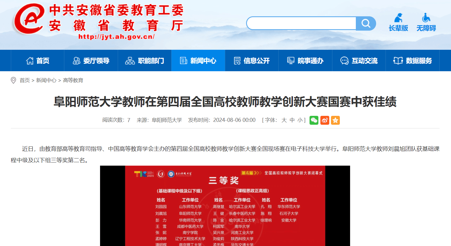8月06日,安徽教育网报道:阜阳师范大学教师在第四届全国高校教师教学创新大赛国赛中获佳绩。文章地址: