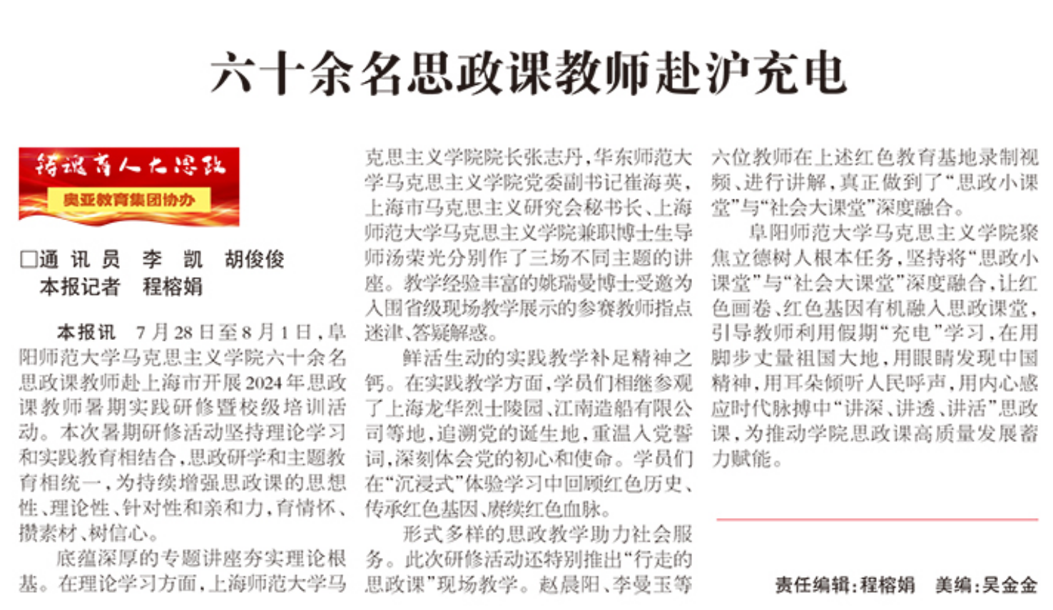 8月07日,安徽青年报报道:六十余名思政课教师赴沪充电。文章地址: