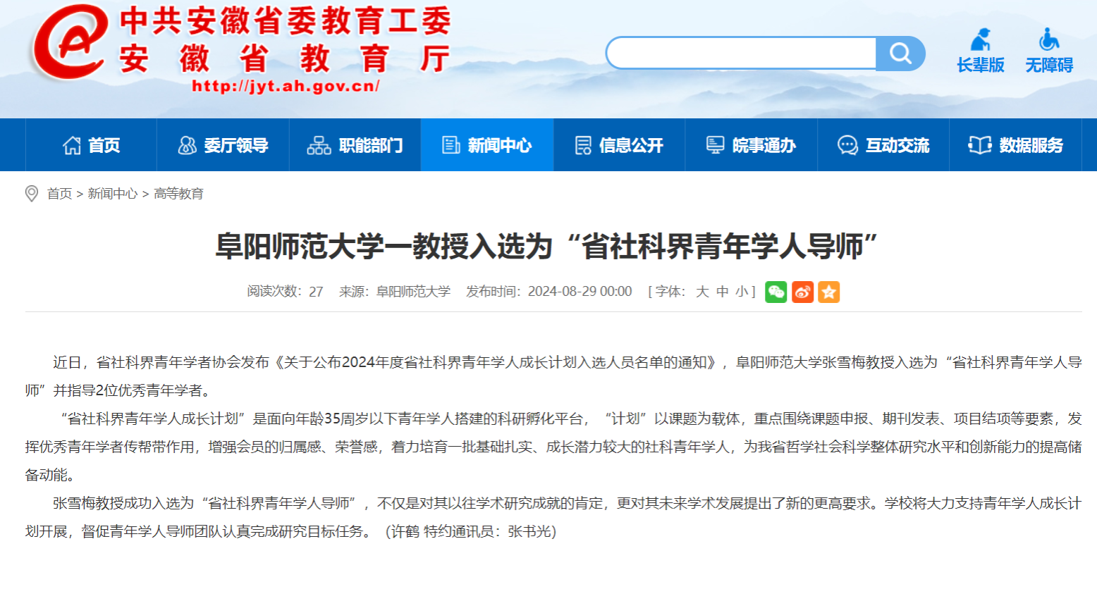安徽教育网报道:阜阳师范大学一教授入选为“省社科界青年学人导师”