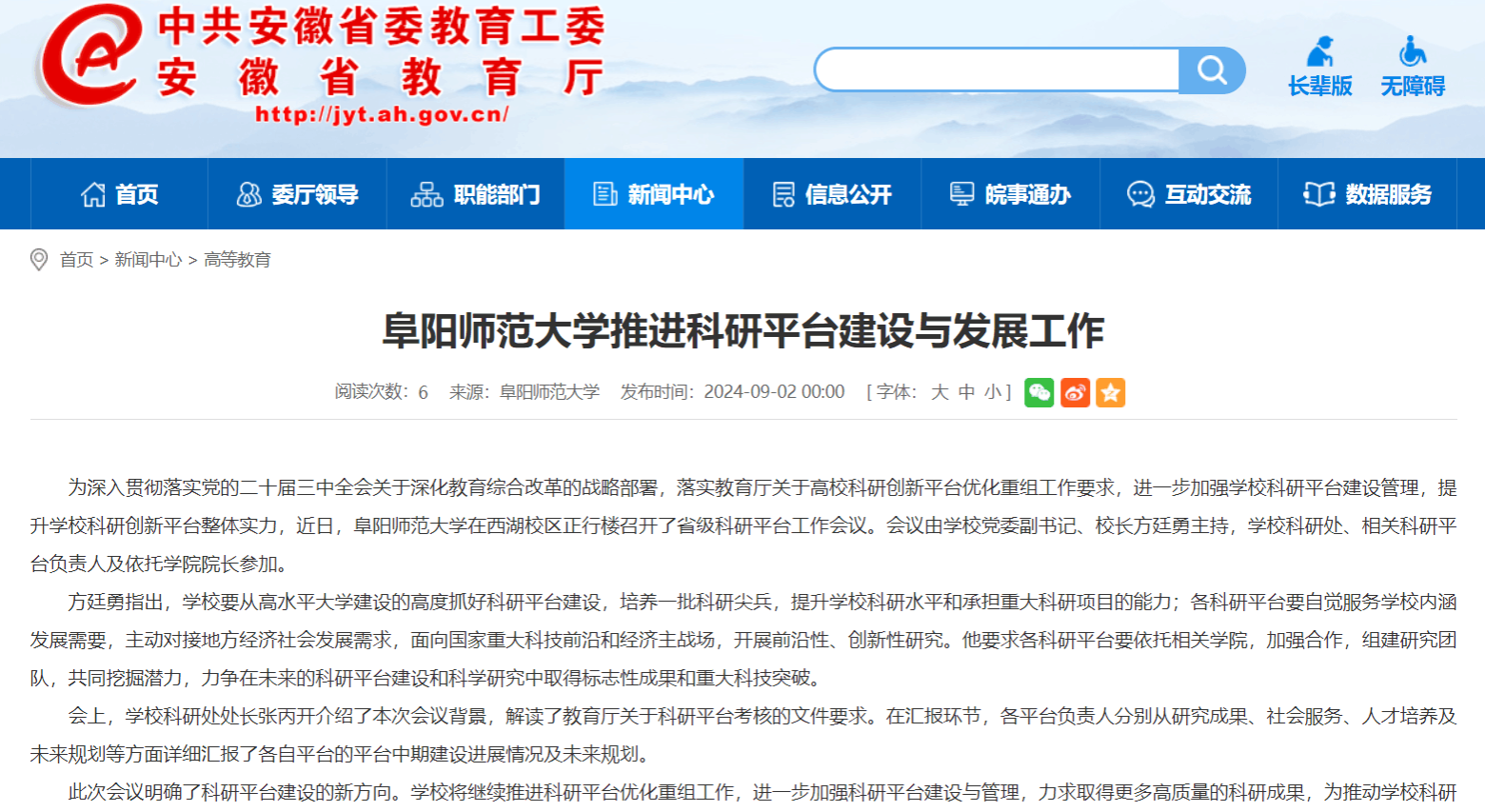 安徽教育网报道:阜阳师范大学推进科研平台建设与发展工作