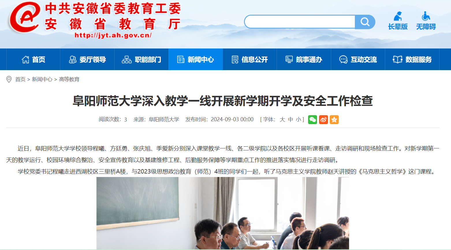 安徽教育网报道:阜阳师范大学深入教学一线开展新学期开学及安全工作检查