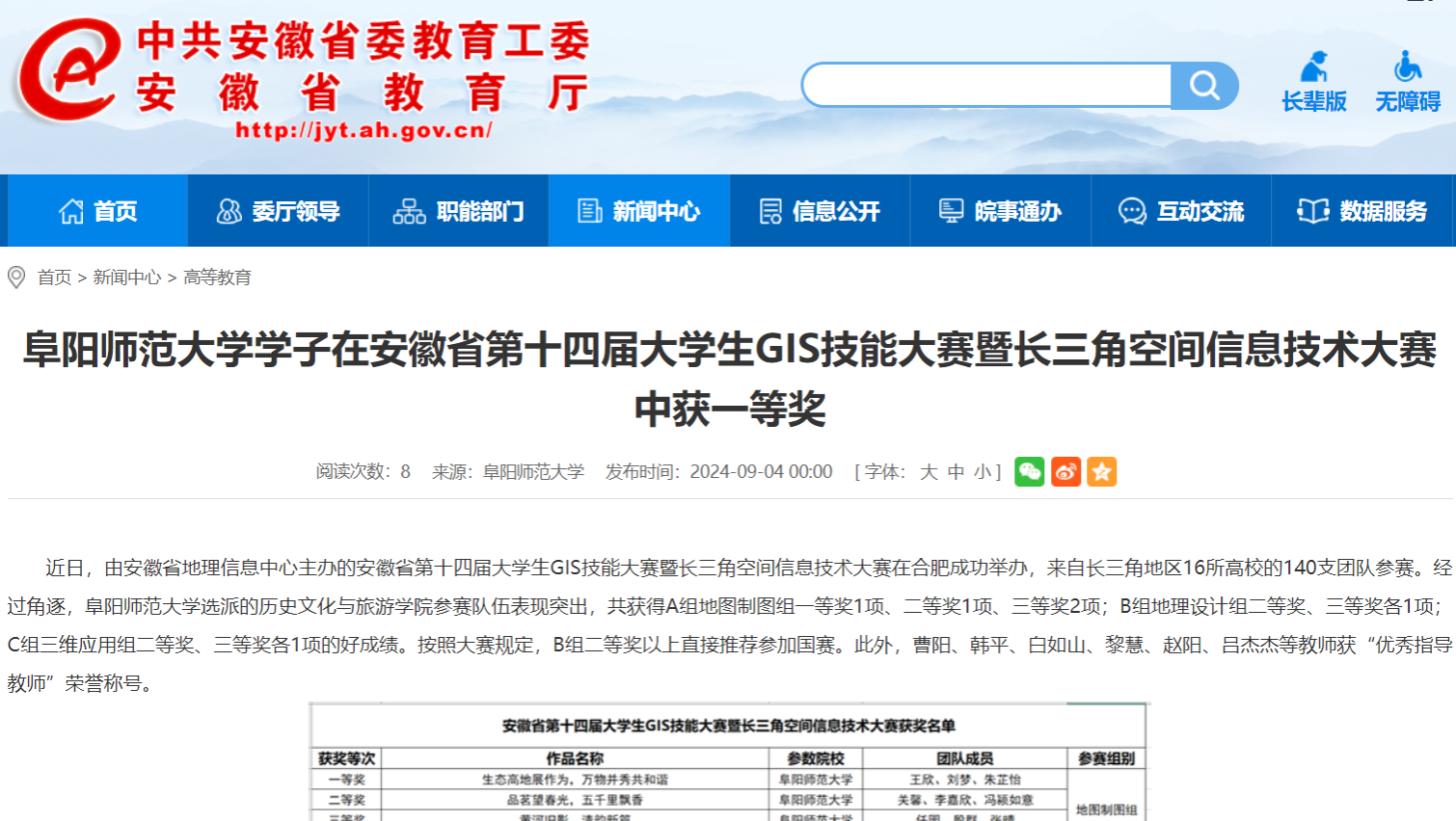 9月04日,安徽教育网报道:阜阳师范大学学子在安徽省第十四届大学生GIS技能大赛暨长三角空间信息技术大赛中获一等奖。文章地址:http://jyt.ah.gov.cn/xwzx/gdjy/40719085.html
