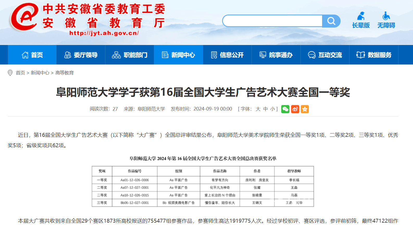 9月19日,安徽教育网报道:阜阳师范大学学子获第16届全国大学生广告艺术大赛全国一等奖。文章地址: