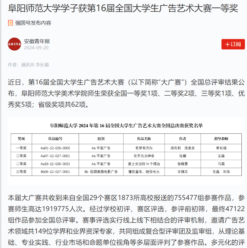 9月20日,“学习强国”安徽青年报平台报道:阜阳师范大学学子获第16届全国大学生广告艺术大赛一等奖。文章地址:https://article.xuexi.cn/articles/index.html?art_id=5297302946474093408&item_id=5297302946474093408&study_style_id=feeds_opaque&pid=&ptype=-1&source=share&share_to=wx_single