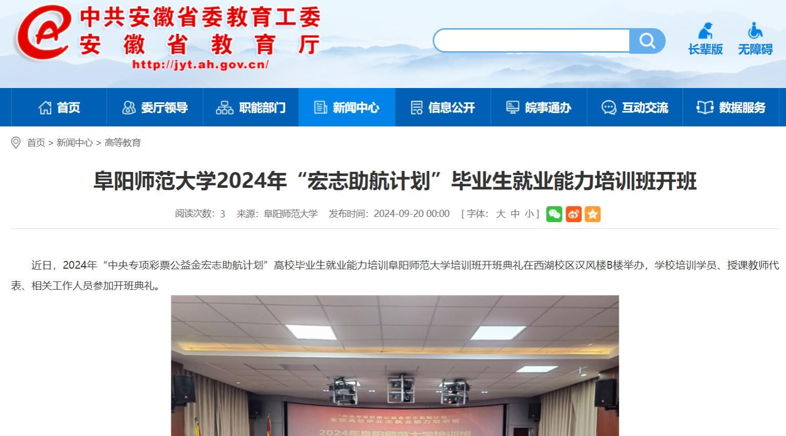 9月20日,安徽教育网报道:阜阳师范大学2024年“宏志助航计划”毕业生就业能力培训班开班。文章地址: