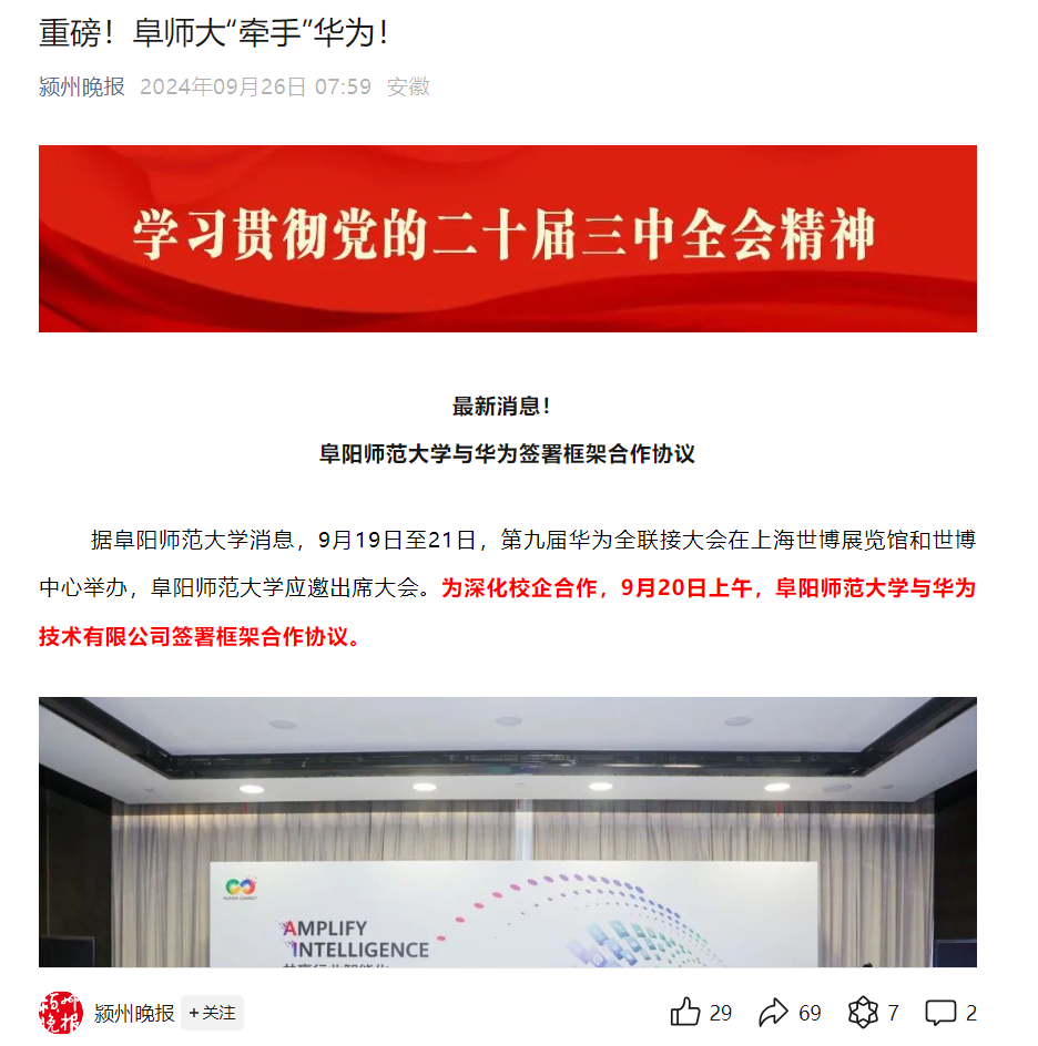 颍州晚报报道:重磅!阜师大“牵手”华为!