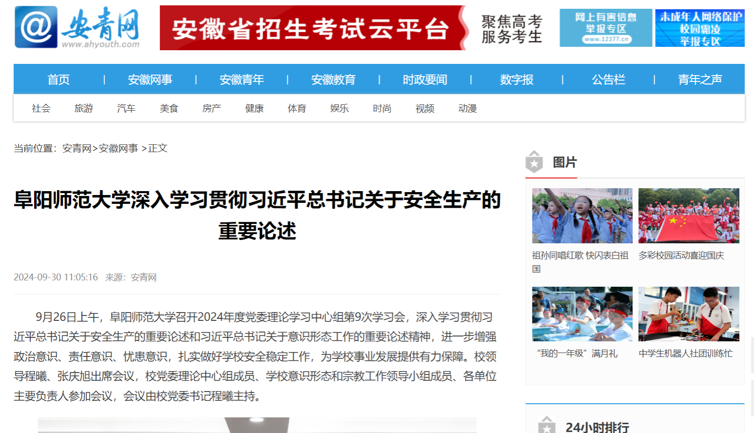 9月30日,安青网报道:阜阳师范大学深入学习贯彻习近平总书记关于安全生产的重要论述。文章地址: