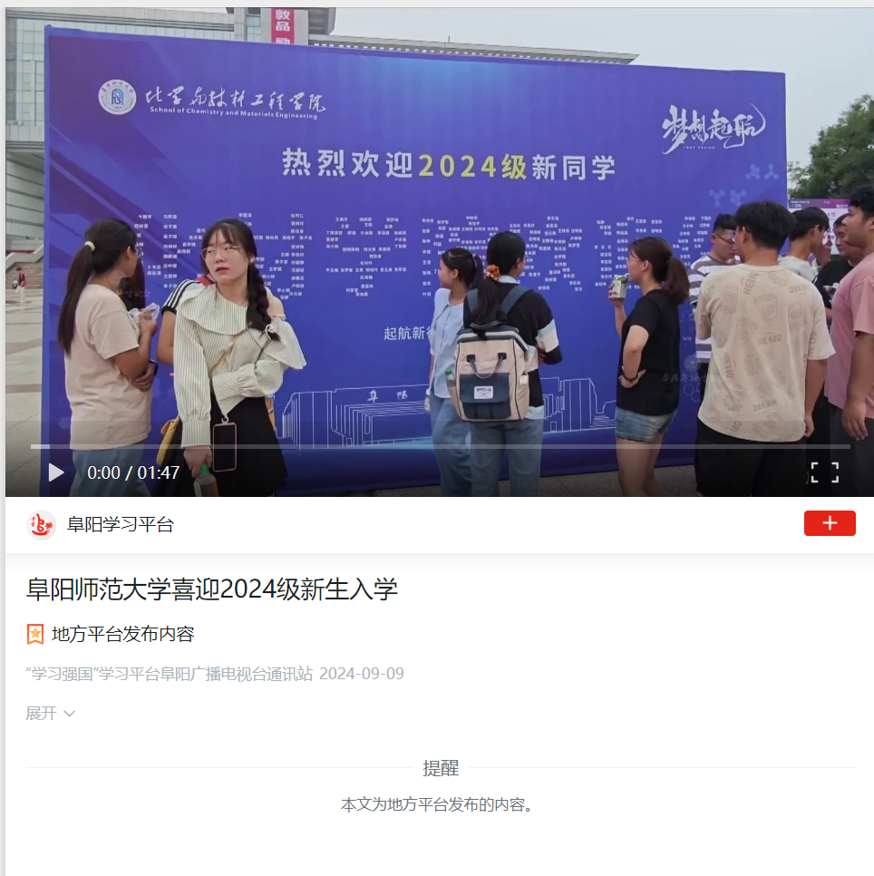 9月09日,“学习强国”学习平台阜阳广播电视台通讯站报道:阜阳师范大学喜迎2024级新生入学。视频地址:https://article.xuexi.cn/articles/index.html?art_id=1686666373759612963&item_id=1686666373759612963&cdn=https%3A%2F%2Fregion-anhui-resource&t=1725853297749&study_style_id=video_default&showmenu=false&ref_read_id=3cb162d4-7f19-42af-8482-8f0af251c43f&pid=&ptype=-1&source=share&share_to=wx_single