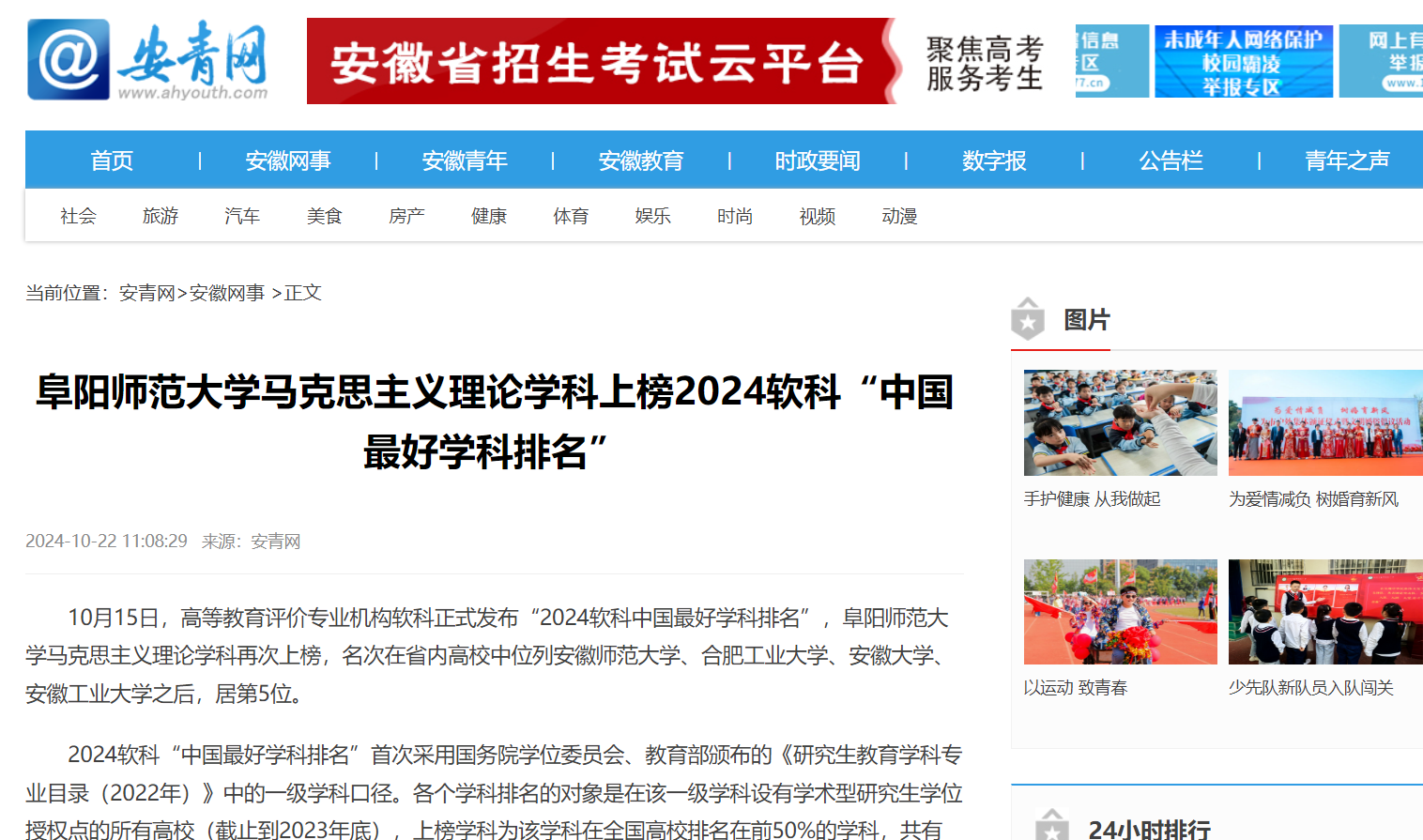 10月22日,安青网报道:阜阳师范大学马克思主义理论学科上榜2024软科“中国最好学科排名”。文章地址:https://www.ahyouth.com/news/20241022/1744327.shtml