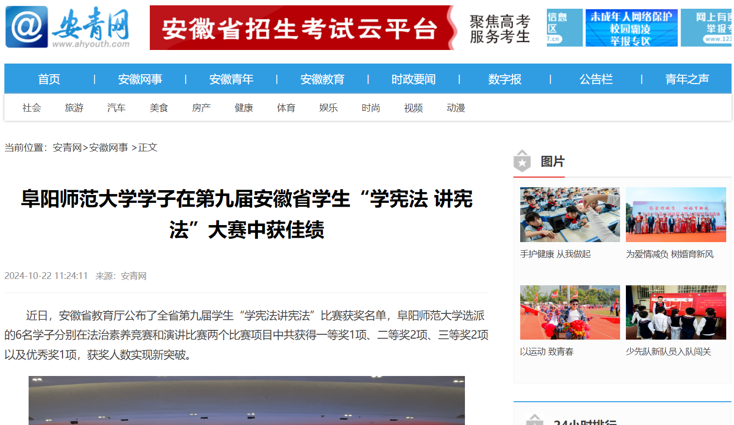 10月22日,安青网报道:阜阳师范大学学子在第九届安徽省学生“学宪法 讲宪法”大赛中获佳绩。文章地址:https://www.ahyouth.com/news/20241022/1744332.shtml