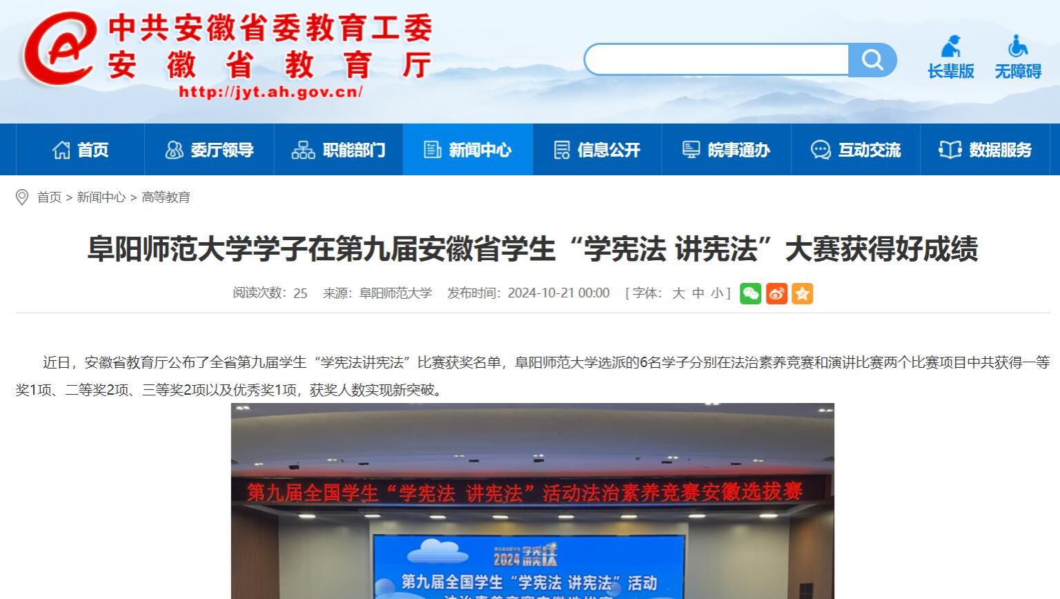 10月21日,安徽教育网报道:阜阳师范大学学子在第九届安徽省学生“学宪法 讲宪法”大赛获得好成绩。文章地址: