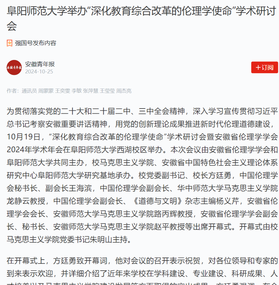 10月25日,“学习强国”安徽青年报平台报道:阜阳师范大学举办“深化教育综合改革的伦理学使命”学术研讨会。文章地址:https://article.xuexi.cn/articles/index.html?art_id=2443458315505775868&source=share&study_style_id=feeds_opaque&reco_id=102d922ff22ec0a8221b000b&share_to=wx_single&study_share_enable=1&study_comment_disable=0&ptype=0&item_id=2443458315505775868