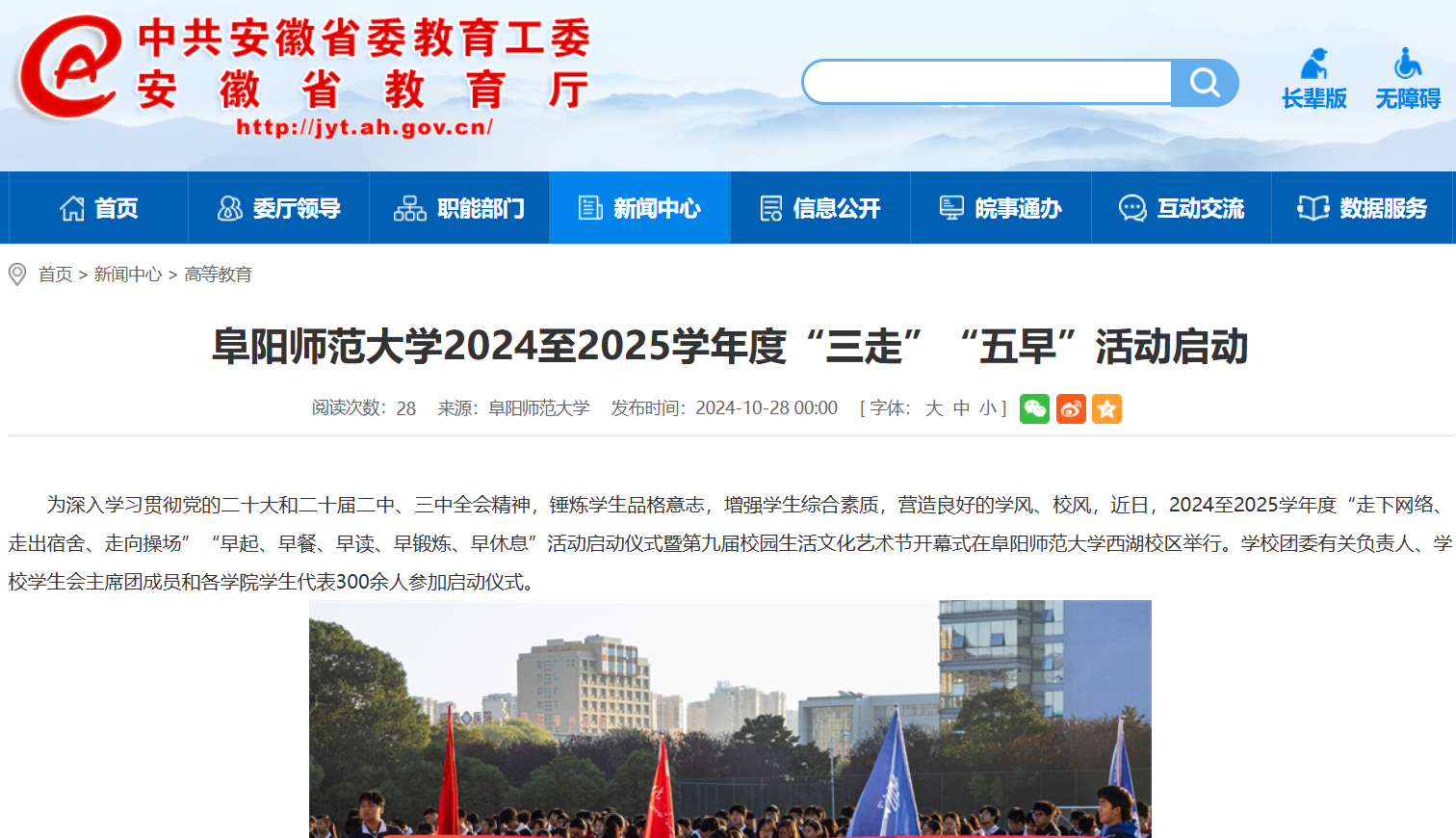 10月28日,安徽教育网报道:阜阳师范大学2024至2025学年度“三走”“五早”活动启动。文章地址: