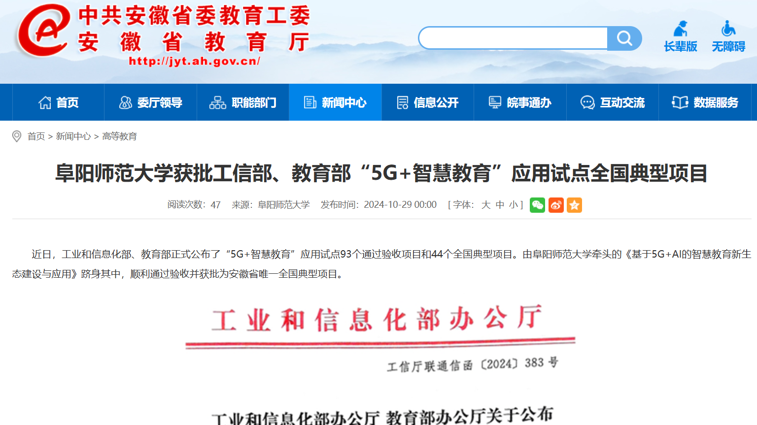 10月29日,安徽教育网报道:阜阳师范大学获批工信部、教育部“5G+智慧教育”应用试点全国典型项目。文章地址:
