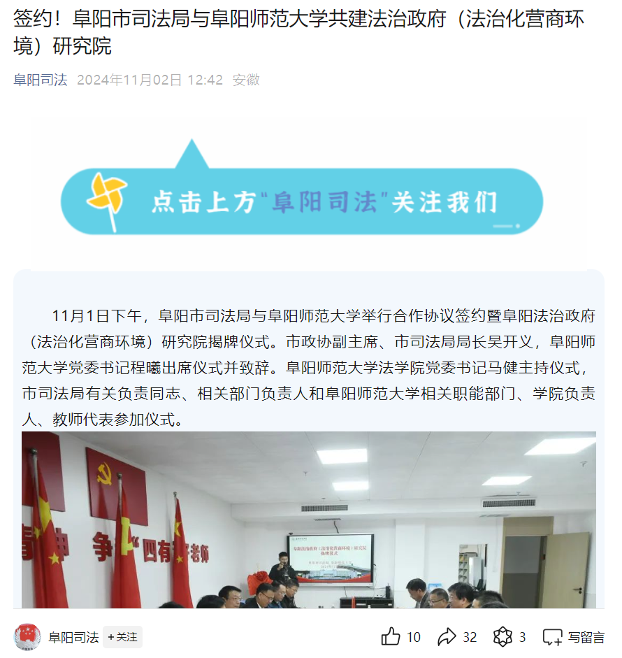 11月2日,阜阳司法微信公众号报道:签约!阜阳市司法局与阜阳师范大学共建法治政府(法治化营商环境)研究院。文章地址:https://mp.weixin.qq.com/s/LqaT-NwG3kAPFGAI54UbWQ