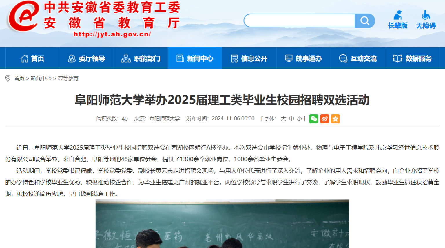 11月06日,安徽教育网报道:阜阳师范大学举办2025届理工类毕业生校园招聘双选活动。文章地址:
