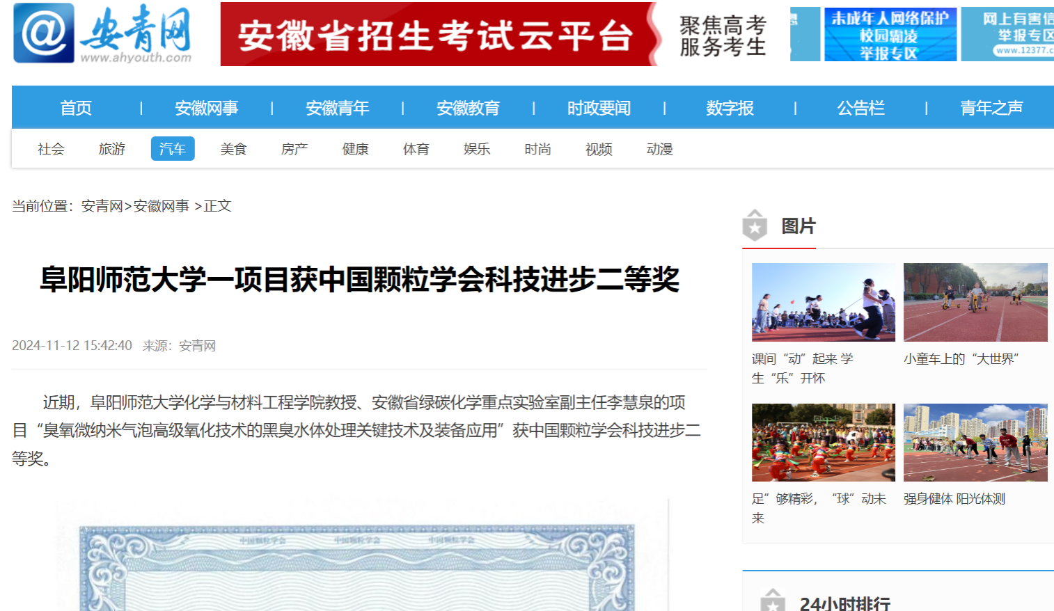 11月12日,安青网报道:阜阳师范大学一项目获中国颗粒学会科技进步二等奖。文章地址: