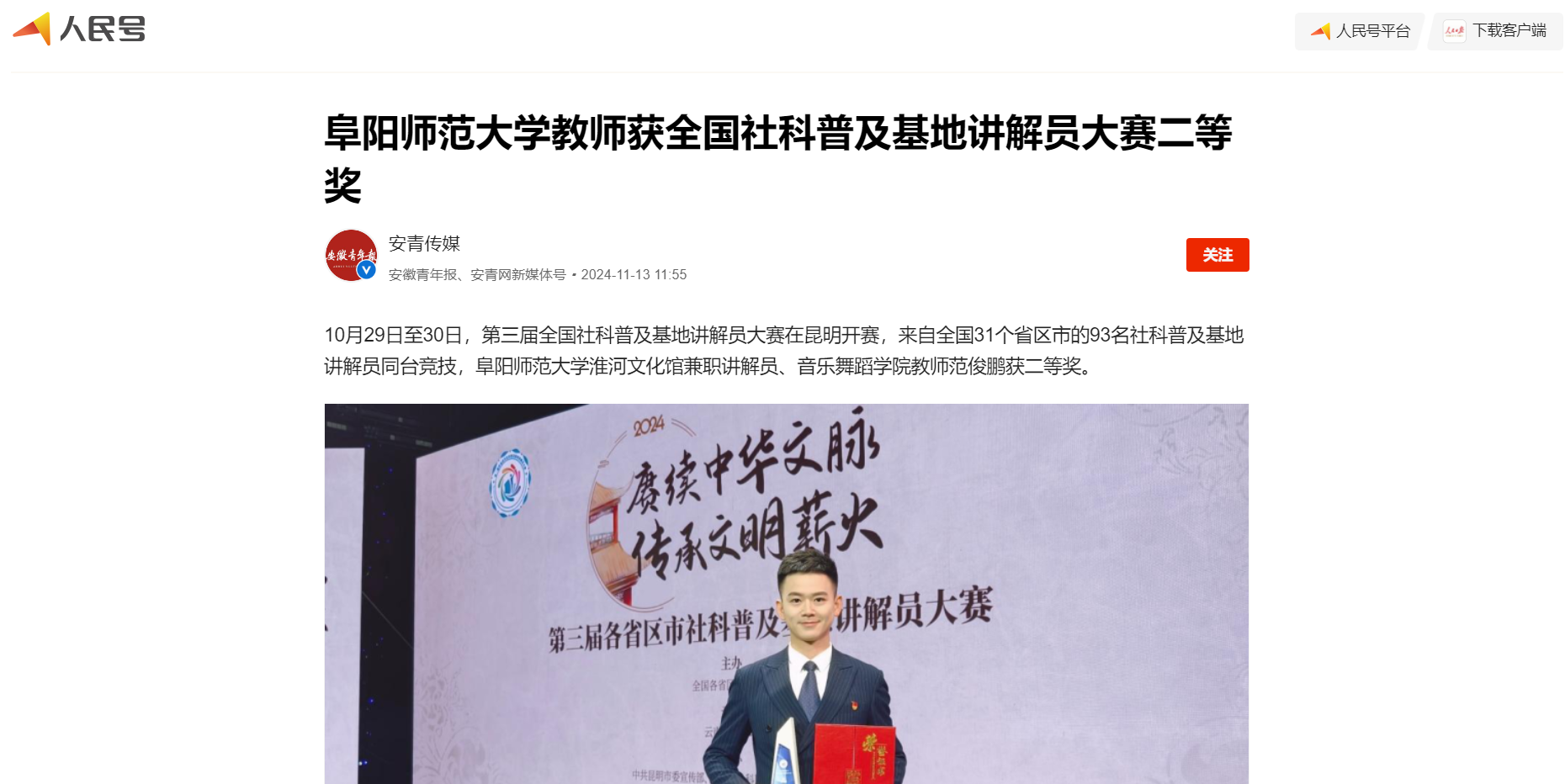 11月13日,人民日报客户端报道:阜阳师范大学教师获全国社科普及基地讲解员大赛二等奖。文章地址:
