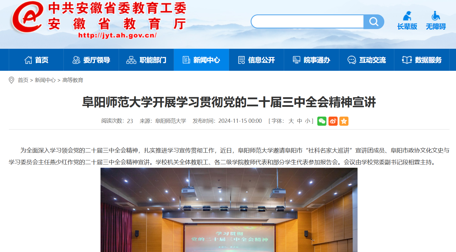 11月15日,安徽教育网报道:阜阳师范大学开展学习贯彻党的二十届三中全会精神宣讲。文章地址: