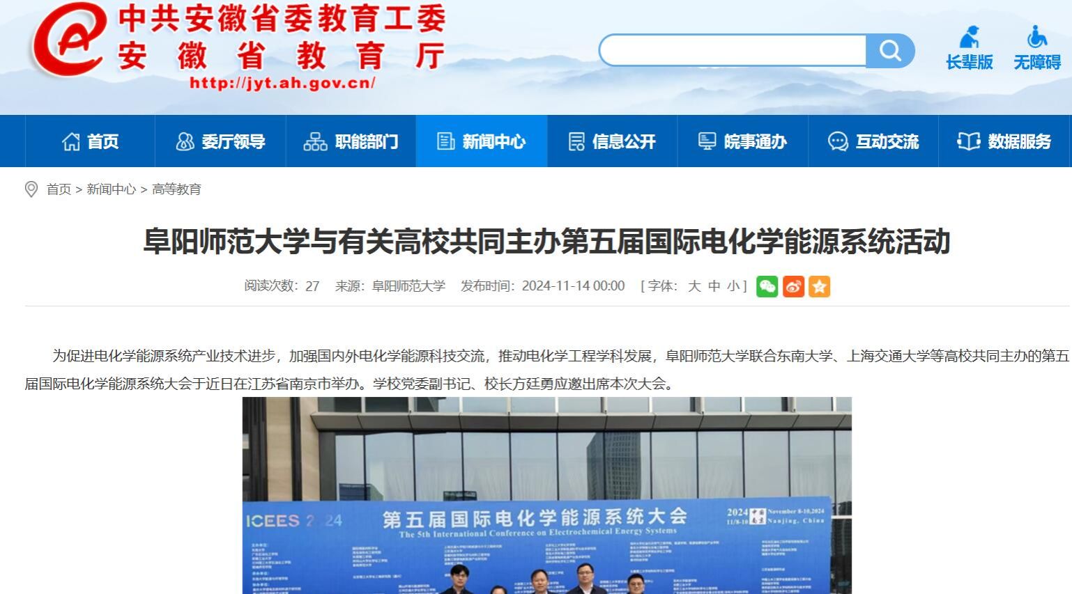 11月14日,安徽教育网报道:阜阳师范大学与有关高校共同主办第五届国际电化学能源系统活动。文章地址: