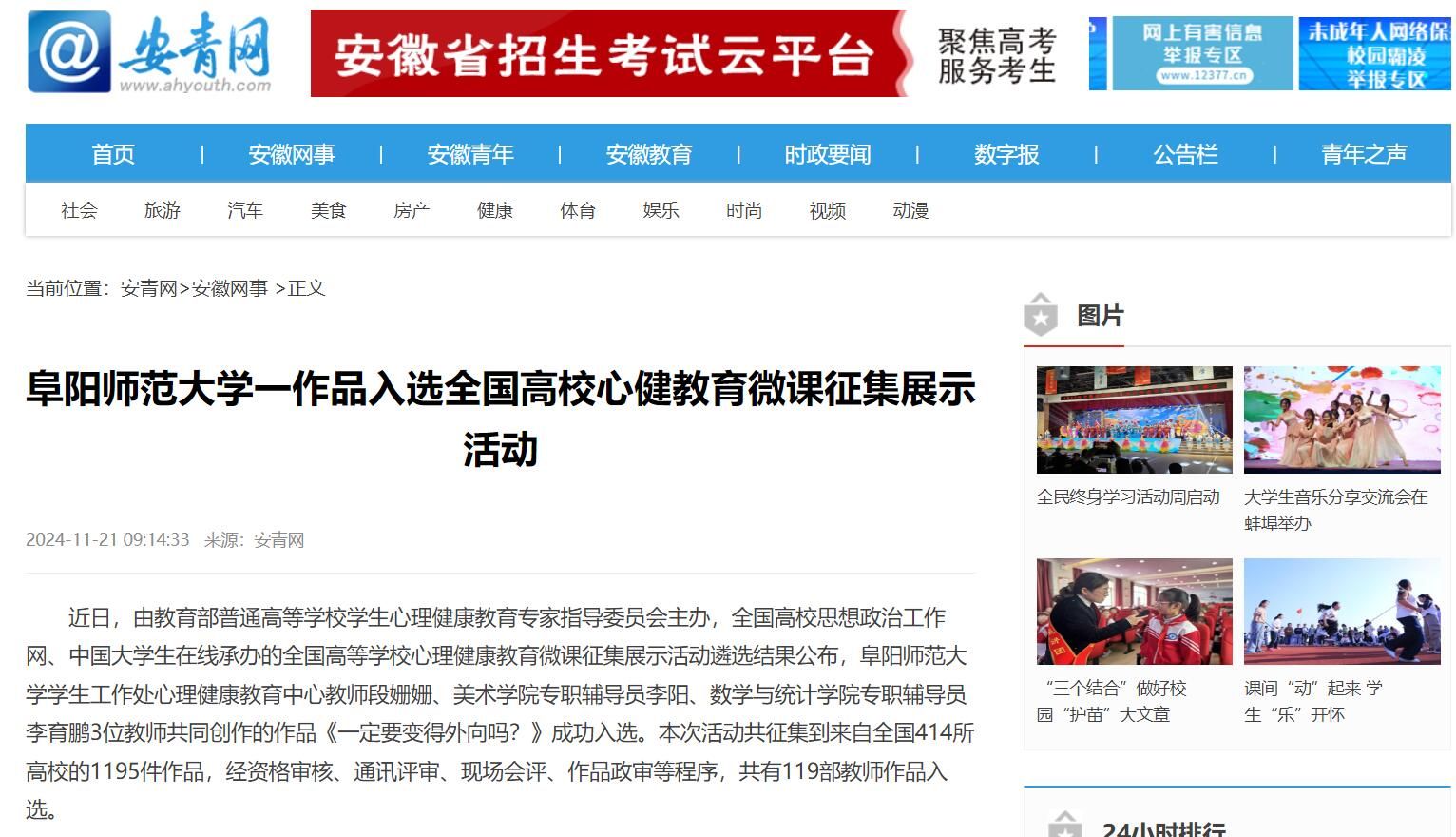 11月21日,安青网报道:阜阳师范大学一作品入选全国高校心健教育微课征集展示活动。文章地址: