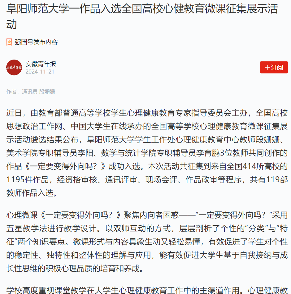 11月21日,“学习强国”安徽青年报平台报道:阜阳师范大学一作品入选全国高校心健教育微课征集展示活动。文章地址:https://article.xuexi.cn/articles/index.html?art_id=8785401476436764336&item_id=8785401476436764336&study_style_id=feeds_opaque&pid=&ptype=-1&source=share&share_to=wx_single