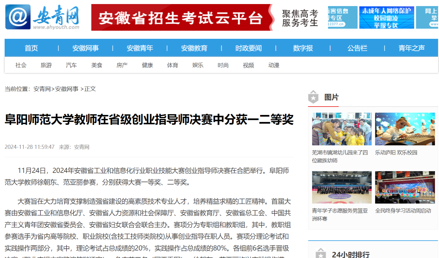 11月28日,安青网报道:阜阳师范大学学子在阜阳师范大学教师在省级创业指导师决赛中分获一二等奖。文章地址:https://www.ahyouth.com/news/20241128/1747374.shtml