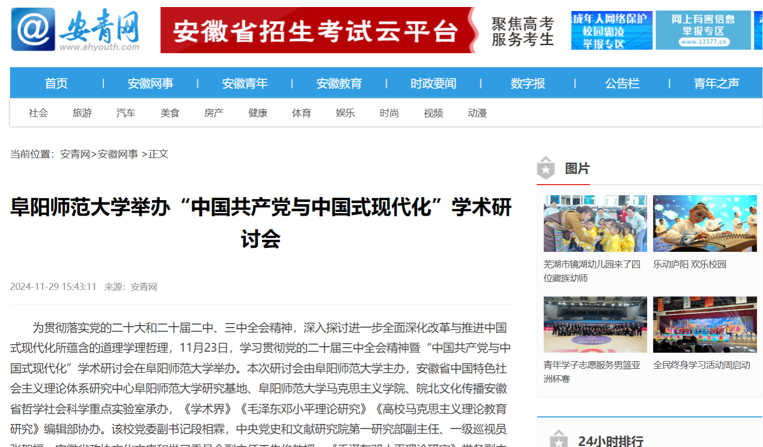 11月29日,安青网报道:阜阳师范大学举办“中国共产党与中国式现代化”学术研讨会。文章地址: