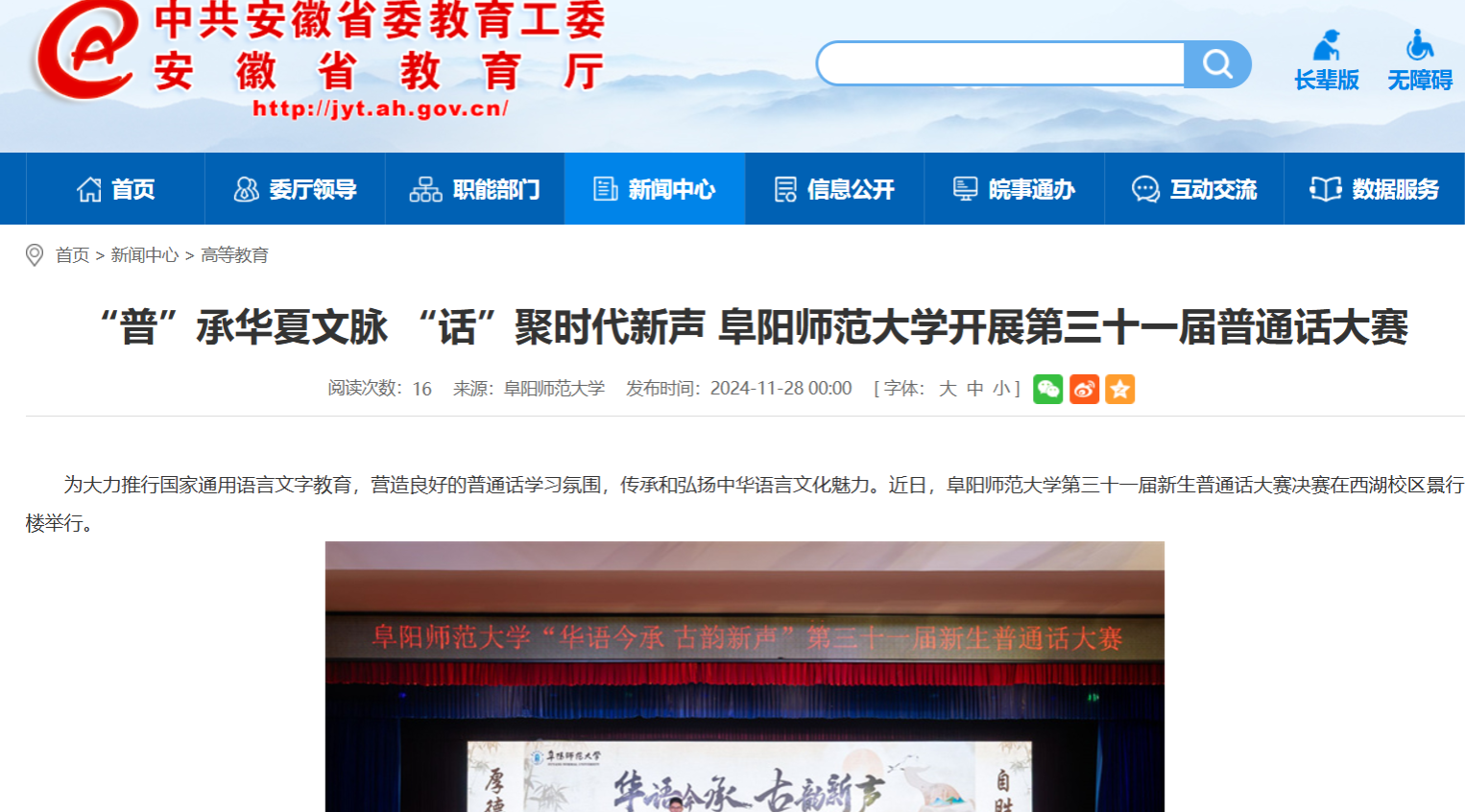 11月28日,安徽教育网报道:“普”承华夏文脉 “话”聚时代新声 阜阳师范大学开展第三十一届普通话大赛。文章地址:http://jyt.ah.gov.cn/xwzx/gdjy/40730087.html