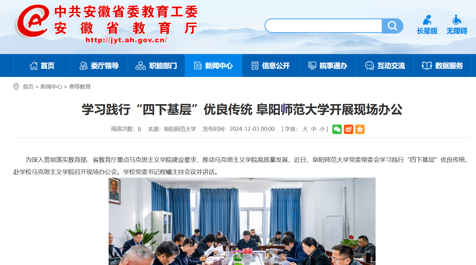 12月03日,安徽教育网报道:学习践行“四下基层”优良传统 阜阳师范大学开展现场办公。文章地址: