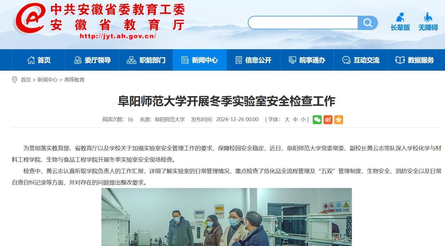 12月26日,安徽教育网报道:阜阳师范大学开展冬季实验室安全检查工作。文章地址: