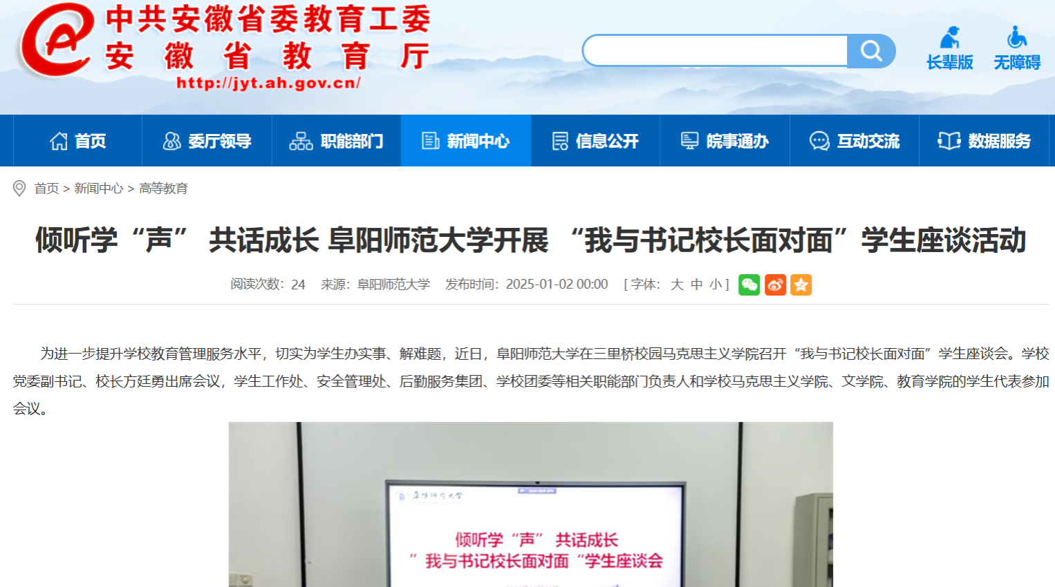 1月02日,安徽教育网报道:倾听学“声” 共话成长 阜阳师范大学开展 “我与书记校长面对面”学生座谈活动。文章地址:http://jyt.ah.gov.cn/xwzx/gdjy/40734135.html