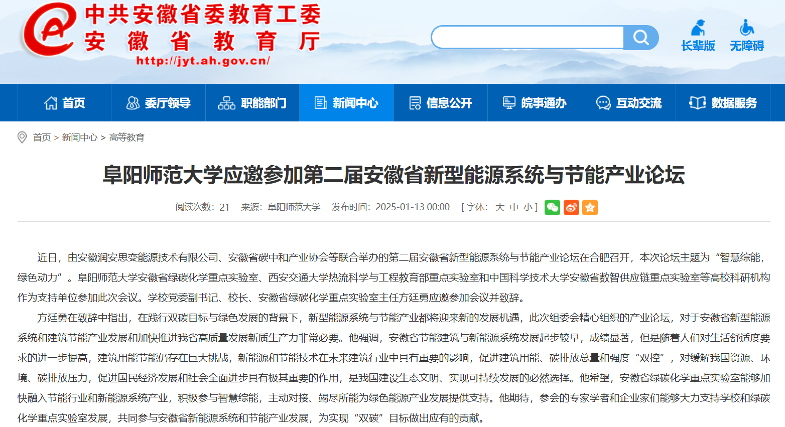 安徽教育网报道:阜阳师范大学应邀参加第二届安徽省新型能源系统与节能产业论坛