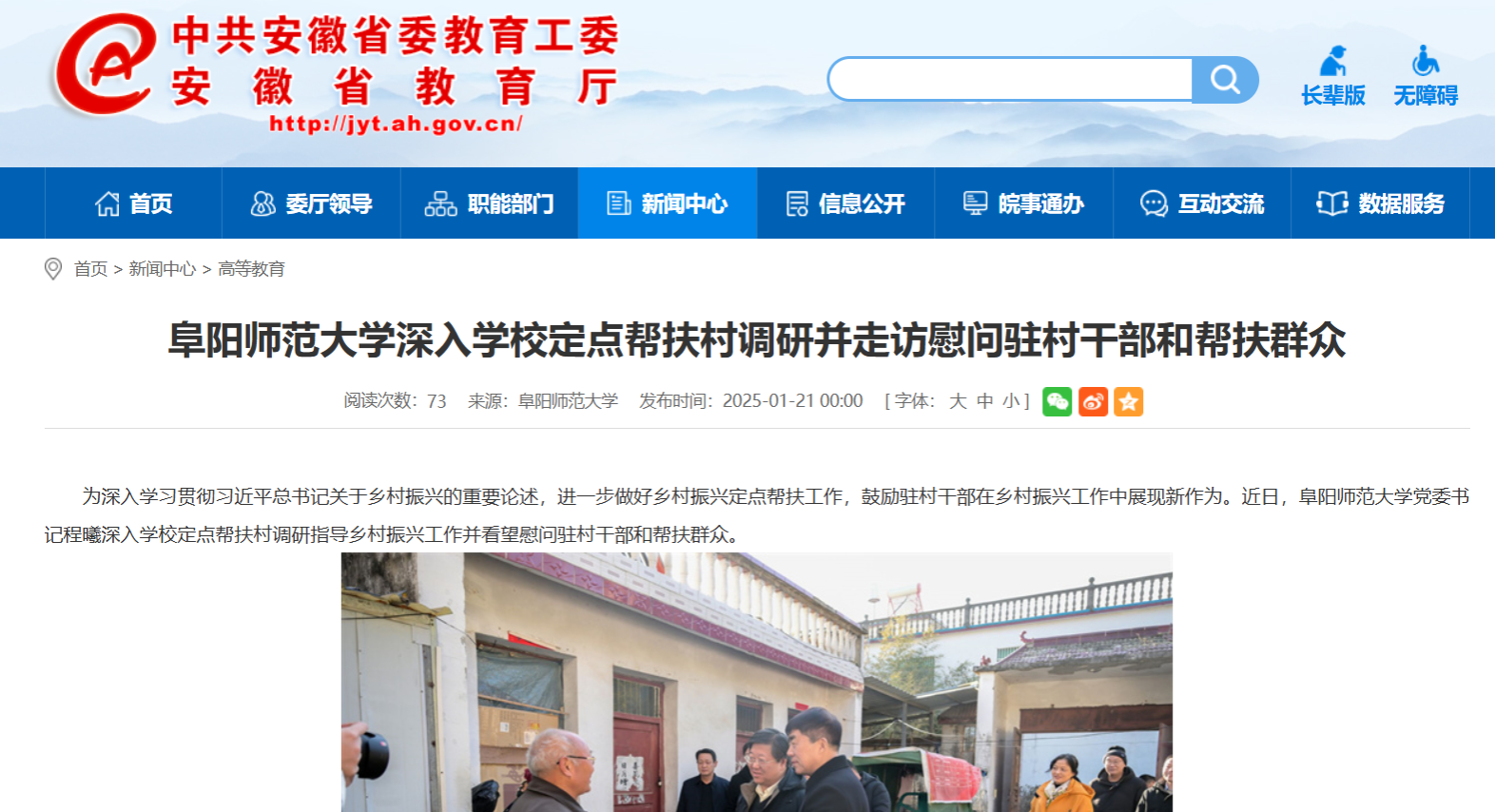 安徽教育网报道:阜阳师范大学深入学校定点帮扶村调研并走访慰问驻村干部和帮扶群众