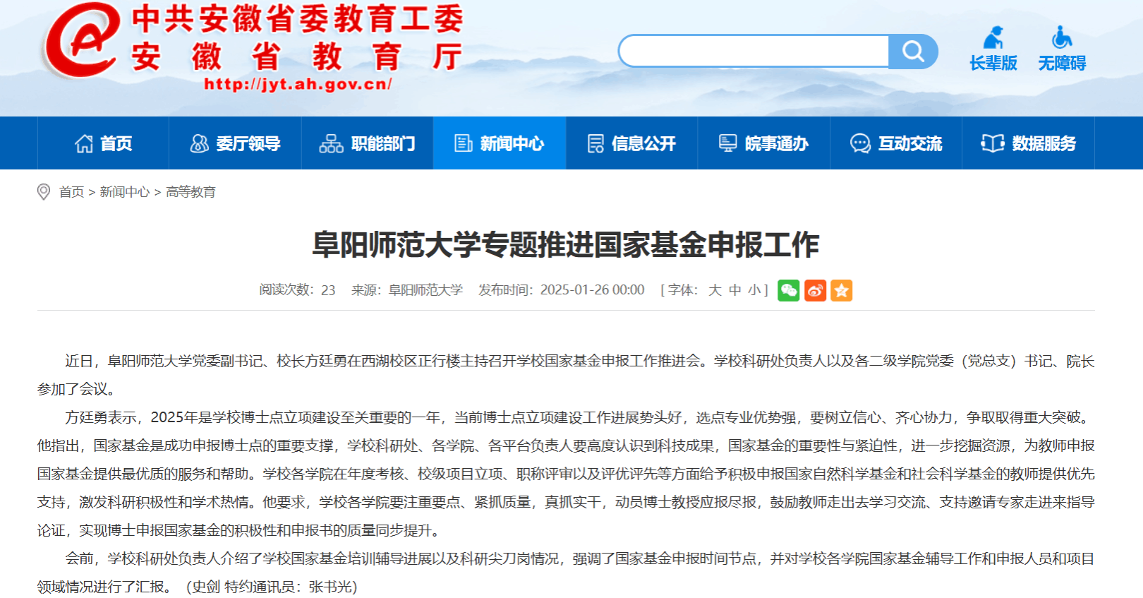1月26日,安徽教育网报道:阜阳师范大学专题推进国家基金申报工作。文章地址: