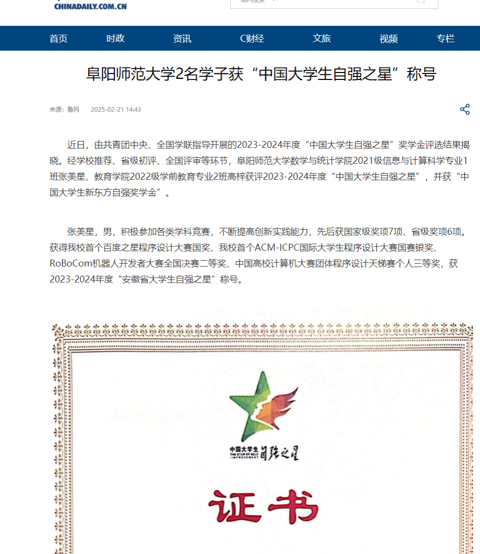 2月21日,中国日报网报道《阜阳师范大学2名学子获“中国大学生自强之星”称号》。文章地址:http://cn.chinadaily.com.cn/a/202502/21/WS67b8219ea310510f19ee8225.html?ivk_sa=1023197a