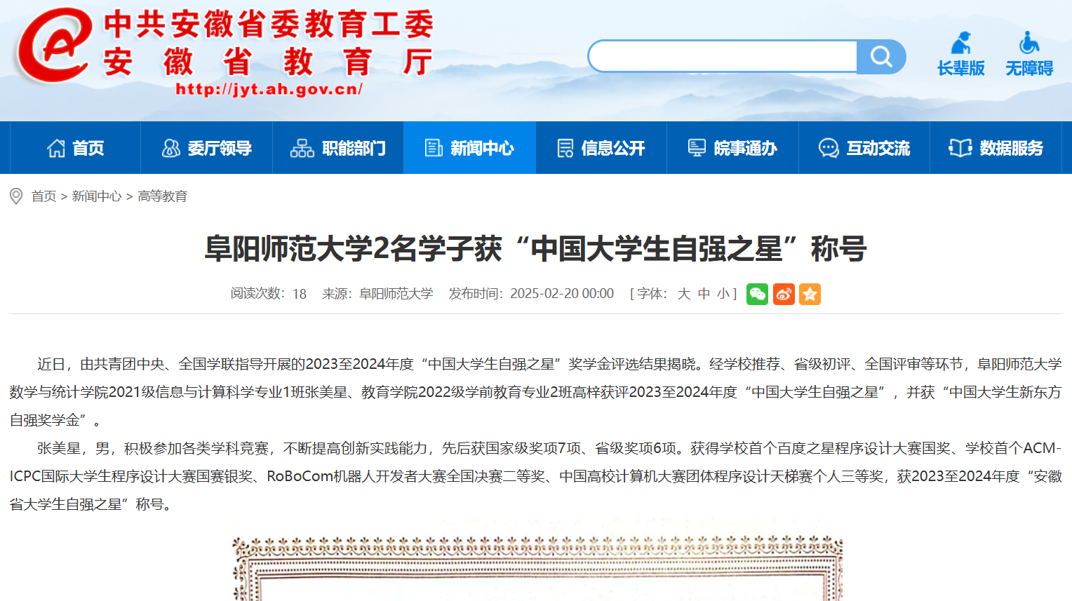 安徽教育网报道:阜阳师范大学2名学子获“中国大学生自强之星”称号