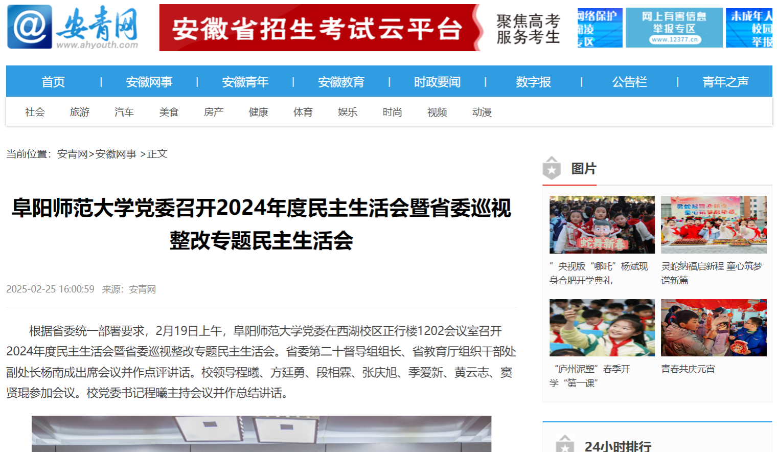 2月25日,安青网报道:阜阳师范大学党委召开2024年度民主生活会暨省委巡视整改专题民主生活会。文章地址:https://www.ahyouth.com/news/20250225/1753184.shtml