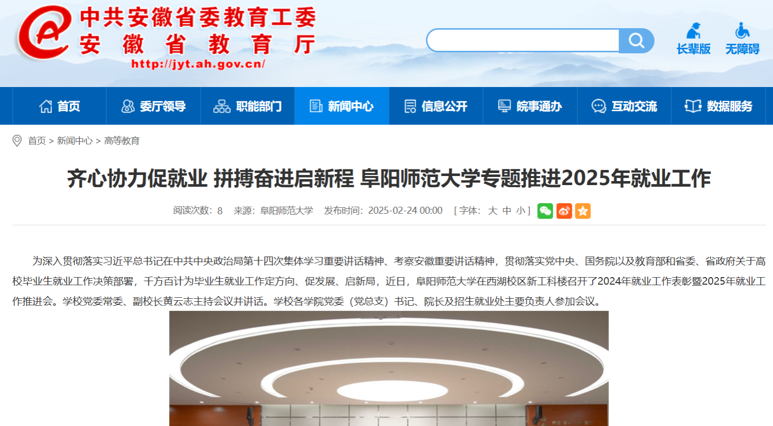 2月24日,安徽教育网报道:齐心协力促就业 拼搏奋进启新程 阜阳师范大学专题推进2025年就业工作。文章地址:https://jyt.ah.gov.cn/xwzx/gdjy/40738987.html