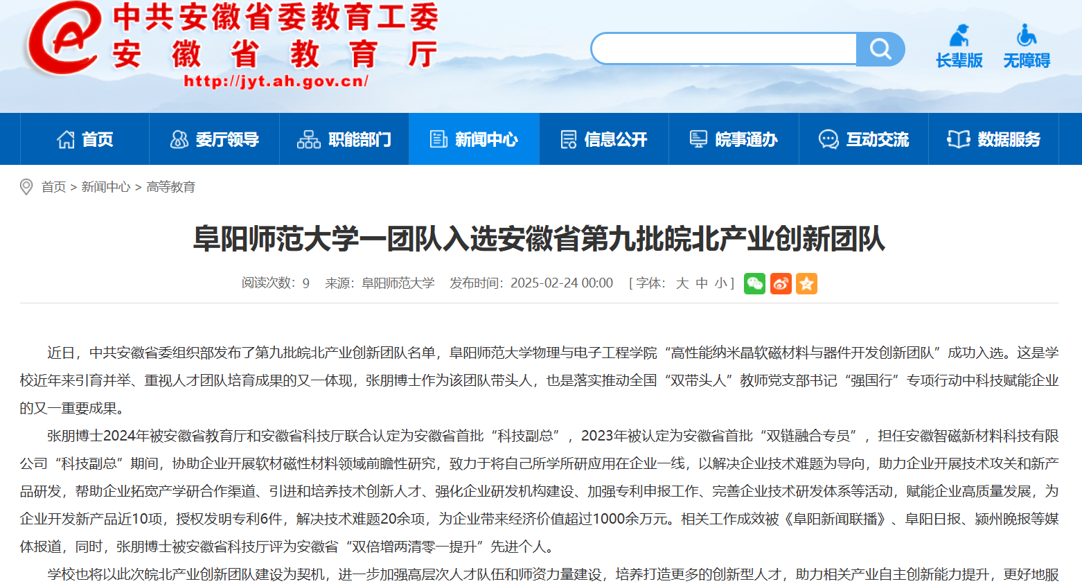 安徽教育网报道:阜阳师范大学一团队入选安徽省第九批皖北产业创新团队