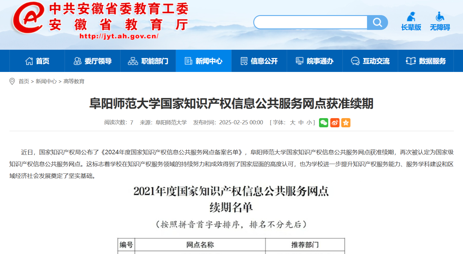 安徽教育网报道:阜阳师范大学国家知识产权信息公共服务网点获准续期