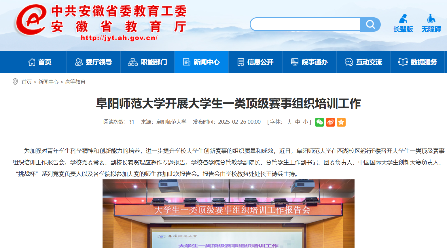 安徽教育网报道:阜阳师范大学开展大学生一类顶级赛事组织培训工作
