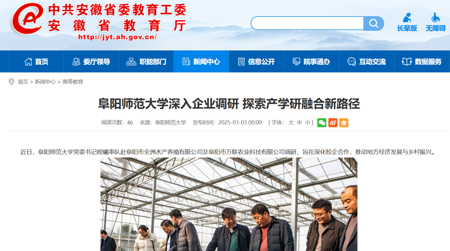 3月03日,安徽教育网报道:阜阳师范大学深入企业调研 探索产学研融合新路径。文章地址: