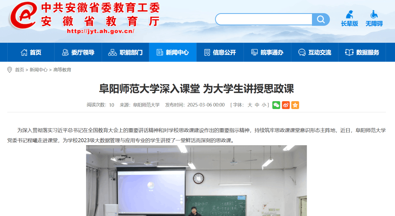 3月06日,安徽教育网报道:阜阳师范大学深入课堂 为大学生讲授思政课。文章地址: