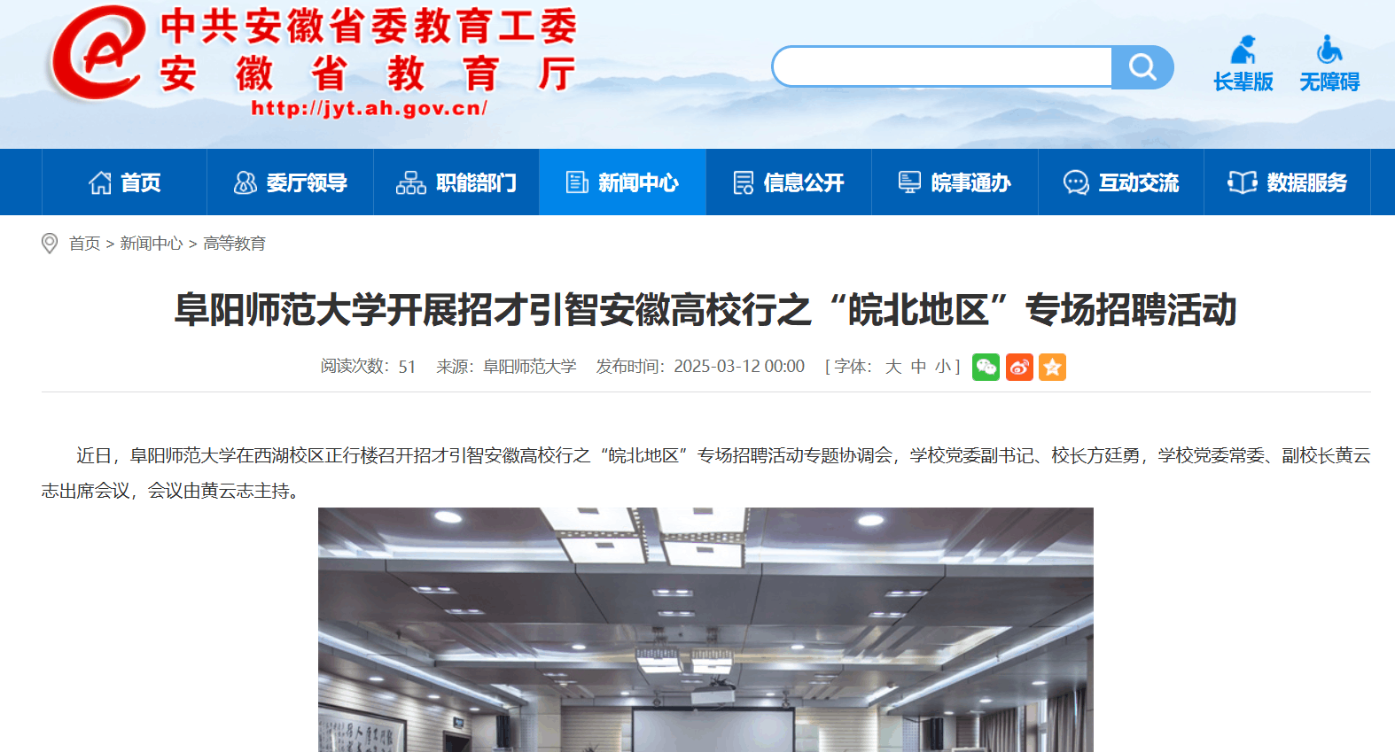3月12日,安徽教育网报道:阜阳师范大学开展招才引智安徽高校行之“皖北地区”专场招聘活动。文章地址: