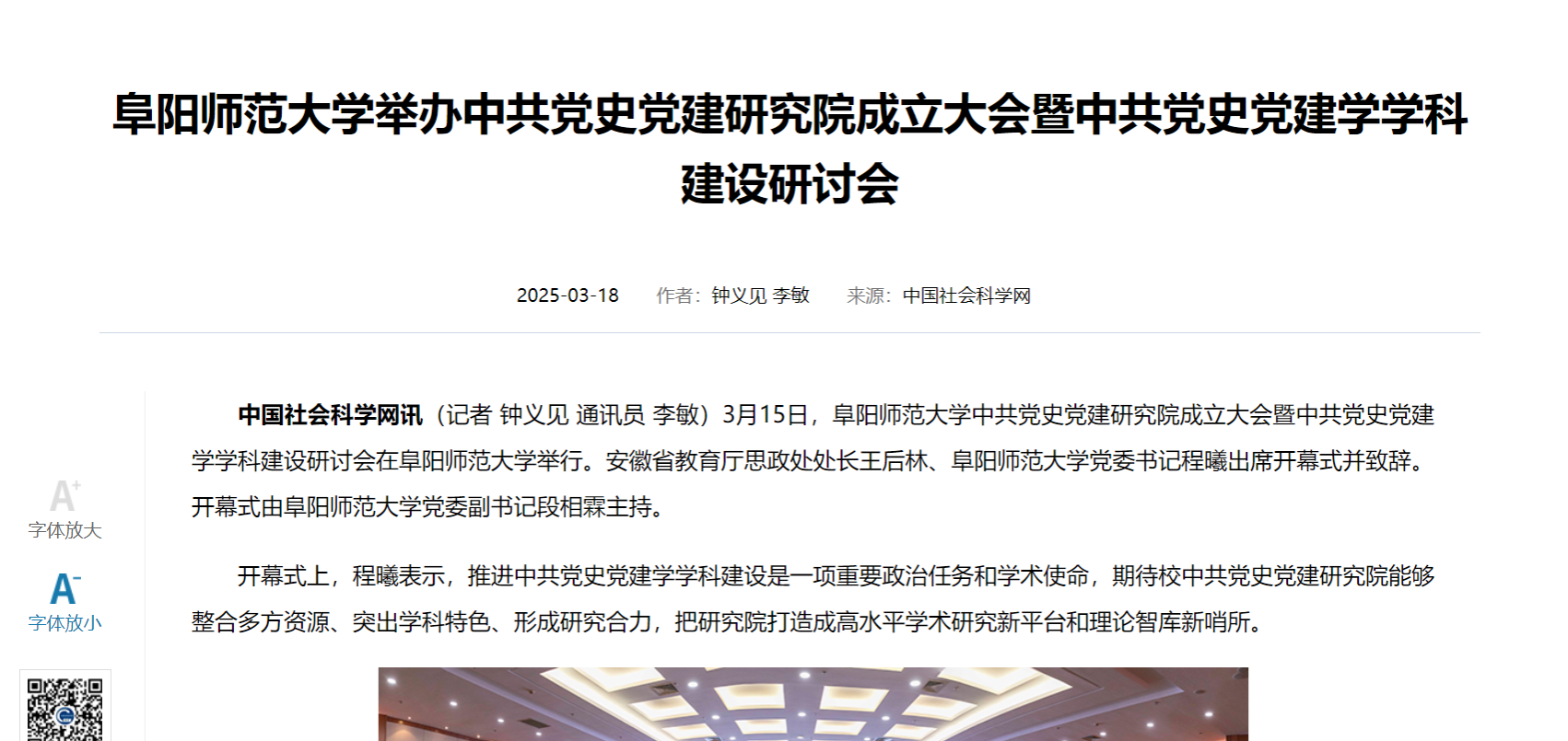 3月18日,中国社会科学网报道:阜阳师范大学举办中共党史党建研究院成立大会暨中共党史党建学学科建设研讨会。文章地址:https://www.cssn.cn/skgz/bwyc/202503/t20250318_5858561.shtml
